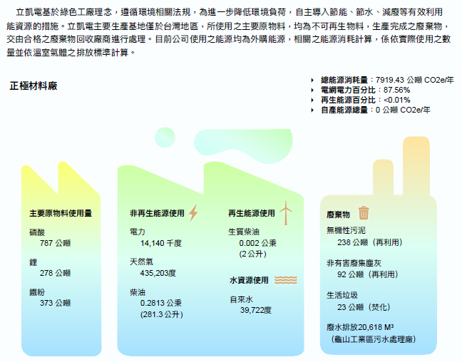 立凱電取水來源為臺灣自來水公司所供應之自來水,主要用途為製造程序使用,包含製程RO純水系統的水源,設備冷卻水塔水循環系統,及製程設備水洗程序使用;非製程使用則用於污染防制設施的溼式洗滌塔及板框式污泥脫水機的沖洗,以及員工的生活用水。