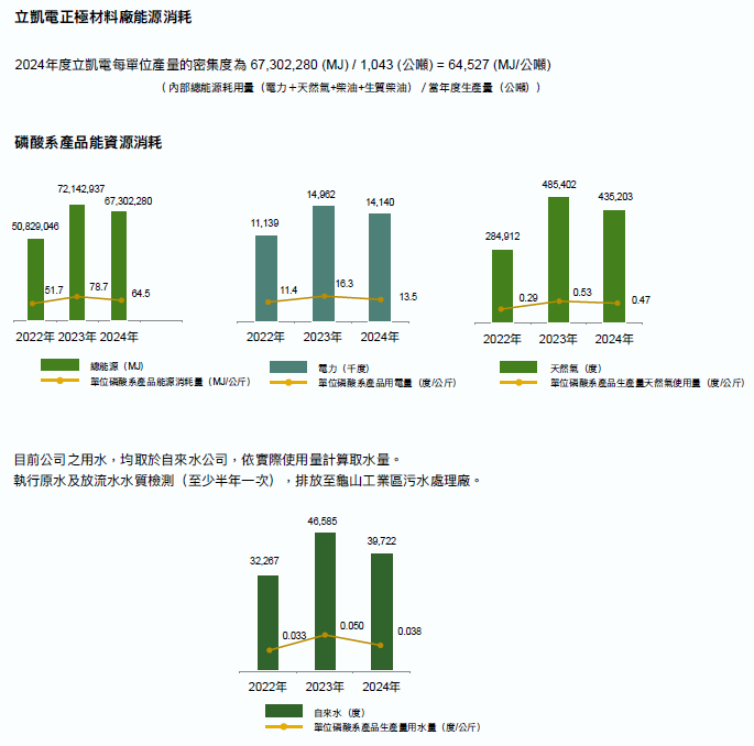 立凱電2024年度全年放流水排放量為20.62百萬公升,排放水質檢測結果,如氫離子濃度指數(pH)、生化需氧量(BOD)、化學需氧量(COD)、懸浮固體(SS)、溶解性鐵(Fe)等項目,均低於放流水法規標準。
