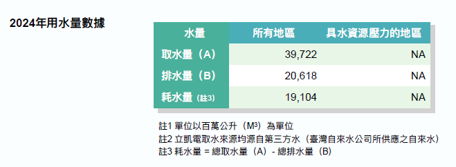 立凱電高度關注氣候變遷可能導致水資源短缺對公司及供應商營運造成的衝擊。經鑑別,目前立凱電所在區域的產製過程用水並非屬於高耗水產業,合作的供應商產品亦非高耗水產品,且水資源取得非來自於具高度水資源壓力的地區。所有這些用水量均來自台灣自來水公司所供應之自來水,非來自於具水資源壓力的地區,因此在高或極高水資源壓力區域的取水量和用水量所占百分比為0%。