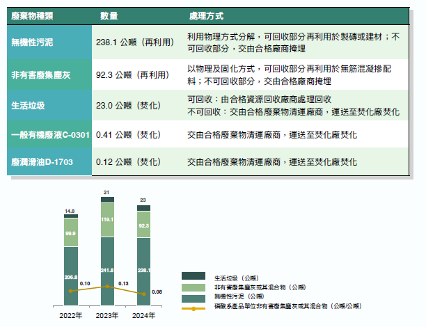 我們除製程效率提升外,同時調整廢水處理藥劑添加量平均值,控制放流水質排放,併降低懸浮物質之排放。針對非有害棄物定期由環境部合格清運廠商來廠清理,運送到環境部合格處理廠,儲存,再利用,製作成下腳料或磚塊。生活廢棄物,紙類,寶特瓶,鐵鋁罐,塑膠類,進行資源回收再利用。而單位磷酸系產品非有害廢集塵灰或其混合物增加部分,為受製程之重製或報廢多寡影響。